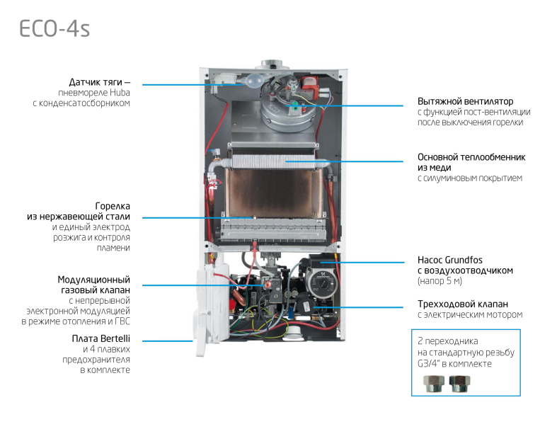- Электронная модуляция пламени: Позволяет точно поддерживать заданную температуру отопления и ГВС, снижая расход газа.